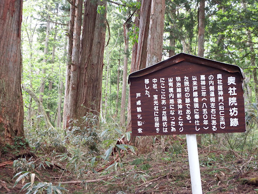 4番目、5番目に戸隠神社九頭竜社と奥社を参拝する事とし、参道を歩き隋神門をくぐったところに奥社院坊跡がありました