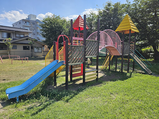 大通りから一本奥に入ったところにある公園。 広めの空き地と数点の遊具、池に交通公園とバリエーションに富んだ構成になっている。 交通公園は信号や踏切があり、楽しみながら自転車に乗れる。 近くの建物で自転車を借りることも可能。 (タイヤの空気がない自転車が多いため、過度な期待は禁物。 また、冬期はお休み。) 遊具は階段や滑り台が付いた立体的なものだが、対象年齢はやや低め。 その他、ブランコと立って棒に掴まりくるくる回る遊具がある。 池は魚が泳いでいて、その周りにあずまやがあったり、 ちょっとした滝があったりする。 大きな木もあるため、池の周りは日陰になる。 トイレもある。(冬期はお休み) 公園の規模に比べて駐車場に駐められる台数は少なく、 また、入り口が狭いため、転回がしづらい。...