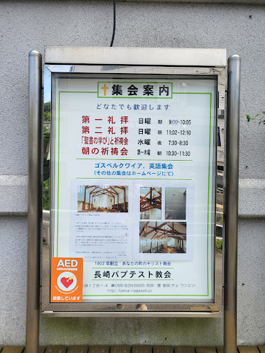 Read more長崎バプテスト教会に知人のコンサートで連れて行ってもらいました!この場所は、長崎県長崎市にあるバプテスト教会で、開放的な雰囲気の中で様々なイベントが行われることで知られています。訪れた印象としては、教会の建築が美しく、コンサートの音響も素晴らしかったです。教会内は静かで落ち着いた空間が広がっており、音楽を心から楽しむことができました。また、コンサート以外にも小学生から大学生以上のグループ活動などが行われているようで、地域コミュニティに根差した活動が印象的でした。特別な体験を提供してくれる場所で、...