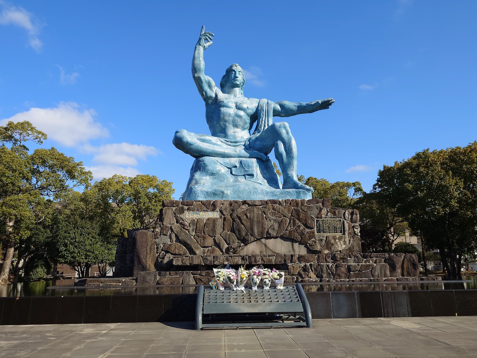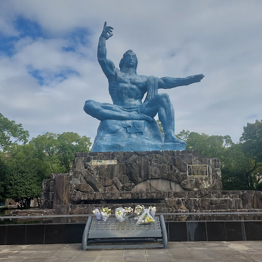 Read moreAn imposing statue that is a focal point of the Peace Park. "This statue was erected by the citizens of Nagasaki in August, 1955, on the 10th anniversary of the devastation of this city by the atomic bomb. Thanks to contributions from Japan and abroad, the ten meter bronze statue, which was designed by Seibo Kitamura, was dedicated as an appeal for lasting world peace and as a prayer that such a tragedy would never be repeated The elevated right hand points to the threat of nuclear weapons while the outstretched left hand symbolizes tranquility and world peace Divine omnipotence and love are embodied in the sturdy physique and gentle countenance of the statue, and a prayer for the repose of the souls of all war victims is expressed in the closed eyes. Furthermore, the folded right leg symbolizés quiet meditation, while the left leg is poised for action in...