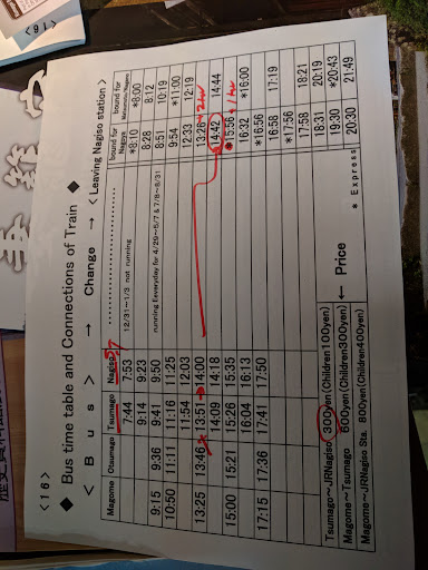 We picked up our bags here after the hike. They also have free WiFi. Good place to get out of the rain. I recommend checking in here and looking at the bus schedule but not picking up your bag. The bus runs irregularly with breaks of almost 2h between noon and 2pm. Once you decided when you want to catch the bus, (I recommend at least 1h to see the town before you go. 2h if having lunch or playing with street food.). Then walk another few hundred meters further and see the old town before coming back to pick up your heavy luggage and the heading to bus depot. Bus to Nagiso costs only a few dollars. The guys are the counter are happy to give you a map and draw exact walking directions to...