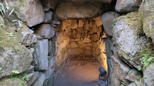 スロープ状の入り口から入りました。 土地の規模は大きくはない小さな公園程度のものですがこんもり土が盛ってありいかにも何かありますといった様子。 高さは3mはあると思います。なんとなく反対にまわってみると鉄の柵で扉のようなものがこしらえてあり異様な感じ。 中を覗いてみるとライトアップされ石室がしっかりとした状態で残っているのがみられます。扉の横にあるスイッチを押すと古墳の説明ナレーションが流れます。石をつんで部屋が作られておりまさに日本の小さなピラミッドだ!と思いしばらく覗いて見ていました