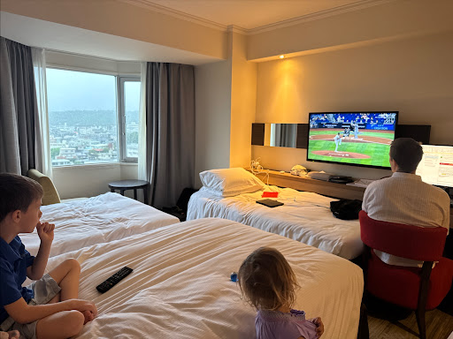 Parking at the hotel is right near the entrance - so you don't have to walk far to get in. The lobby is fairly spacious, check-in was standard Japanese semi-efficient (could always be quicker, but it's fine). We got a deluxe room on a fairly high floor which was good - and also free breakfast in the morning. Not sure what was deluxe about the room, but the view was nice. Also - signature doubletree cookies!