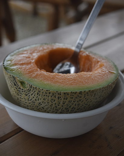 スプーンをメロンに突き刺し、ぐるっと回して、その果肉を口に一気に入れる。