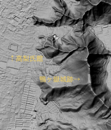 中世の北信濃国衆、高梨氏の館趾。国指定史跡なので土塁や空堀、屋敷跡等はキレイに整備されており見応えがある。臨戦態勢ゴリゴリの戦国館趾かと思いきや、枯山水の(作られた当初は池泉式の)庭園跡があるのが非常に興味深い。戦乱に明け暮れる中でも雅の心を忘れない気構えがあったのか、心の余裕を保てる程の比較的平穏な地域だったのか、想像が膨らむ。史跡平面図をよく見ると、駐車場がある南側入口の土橋と復元されたらしい木橋は描かれておらず、史跡の整備時にでも作られたモノか。また敷地内の8棟の建物趾や庭園は東側半分の区域に全て集中しており、西側半分には何も無い。平面図上でも何も描かれておらず、案内板の類いも見当たらない。敷地の北西に管理棟と思しき古民家風の建物があるだけ。発掘調査をしていないのか(6年に及んだという調査で、ソレは考えにくいが)。調査では何も検出されなかったのか。もしかしたら馬場や武芸修練場の様な施設でもあったのか。もしかしたら管理棟に見えた古民家風の建物は個人の家屋で、西半分は個人所有の土地なのか。ナゾ。 ⇒後日、本屋の立ち読みで調べてみた。ナゾの西側半分にも数棟の不規則な配置の建物趾はあったらしいが、それよりも、南辺土塁と北辺土塁それぞれの真ん中あたりにある折れを結ぶ線を境に、東側と西側では築造年代が違うらしいことが判った(東側が後年代)。恐らく大手は二つの虎口を設ける西辺であり(詰めの城があった城山は東部後方)、築地塀が検出されたのも南辺土塁の折れの西側=旧年代側であることから、この施設の成立過程が何となく浮かんで来る。築造当初は築地塀で囲われた施設であったのが、後に敷地を倍に拡張、更に四方を空堀と土塁で囲み(西側の築地塀は埋め立て)、大手方面に折れを設けて防御性を向上させた...