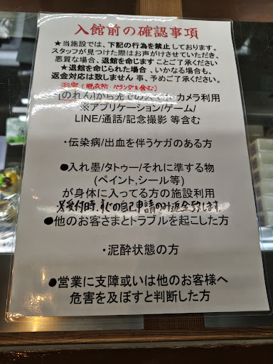 Read moreタトゥーは入浴禁止と非常に不快で差別的な対応を受けました。入浴中に係員が(それも英語で…)風呂場から出る様に指示されました。 しょうがなく納得して了承したのですが、全裸なのでその係員が離れるのを待っていたのですが、ずっと僕の事を熟視して離れてくれませんでした…...