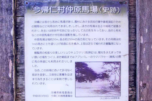 Read more琉球競馬(ンマハラシー)の馬場跡です。 琉球王朝時代は沖縄の各地に設けられた馬場で競馬が行われていたと記録が残っており、大東亜戦争前もまだ行っていたそうです。 ※競馬とはいうものの、現代のような速さを競うものではなく、歩様の美しさを競ったりと、馬場馬術に似たものだったようです。 今では現存する馬場も少なくなり、当時の姿を残せているのはこの仲原馬場くらいかもしれません。