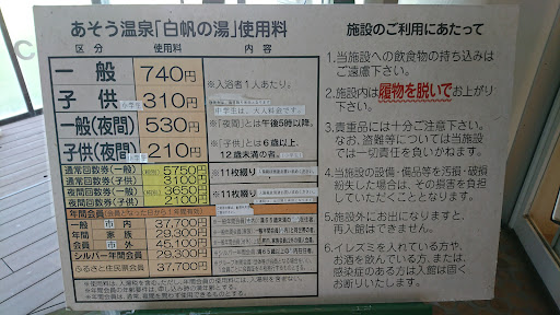 微黄褐色透明無味塩素臭(源泉加温循環ろ過塩素掛け流し) 源泉名:麻生第一温泉 源泉泉質:メタけい酸にて温泉に適合 源泉pH値(酸性0-純水7-アルカリ性14):6.7 飲泉不可 入湯料平日740円、17時から530円 ロッカー、シャワーカラン、シャンプー類、ドライヤー 内湯二つ(水風呂含まず、源泉加温循環ろ過塩素掛け流し、通常湯薬湯) 半露天一つ(源泉加温循環ろ過塩素掛け流し)