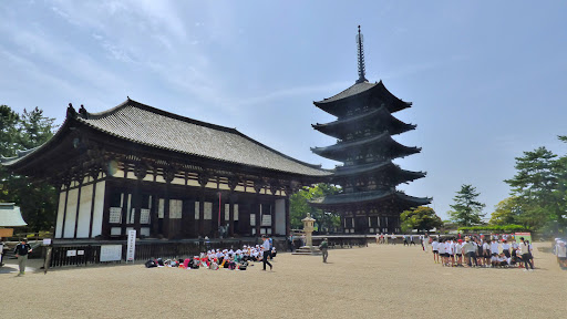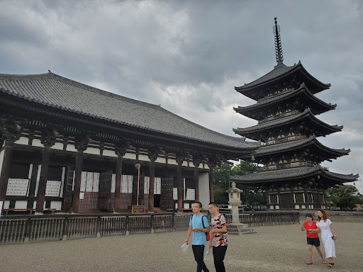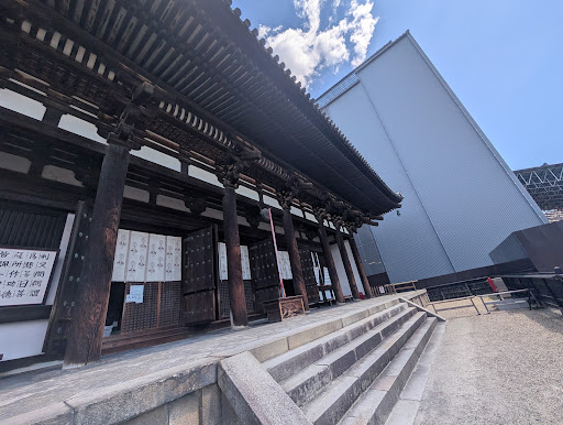 Historically, three Golden Halls—Central, Eastern, and Western— stood at the heart of the Kohfukuji temple complex. Of these, the Eastern Golden Hall was originally built at the behest of Emperor Shōmu (701–756) to pray for the convalescence of his aunt, retired Empress Genshō (683–748). Upon its completion in 726, a triad consisting of Yakushi Nyorai, commonly known as the Medicine Buddha, and his attendant Bodhisattvas Nikkō and Gakkō was installed on the central altar and surrounded by other images. In addition, the altar was lined with glazed green tiles to evoke the Pure Beryl Radiance Realm, the pure land of the Medicine Buddha. Over the centuries, the Eastern Golden Hall was consumed by fire five times, most recently in 1411. The current hall was consecrated in 1415. Although technically a structure from the Muromachi Period (1336–1573), it intentionally employs archaic architectural features, such as a covered porch stretching the full width of the front face of the building, three-stepped bracket complexes supporting the rafters, a hipped (as opposed to a pitched) roof, and a tiled stone floor to evoke the aura of the original Nara-period (710–794) building. Today, the Eastern Golden Hall enshrines an assemblage of images that provide a panoramic overview of the entire history of Japanese Buddhist art. These include the central icon, a copper-alloy image of Yakushi Nyorai cast in the Muromachi Period, copper-alloy images of the Bodhisattvas Nikkō and Gakkō (Hakuhō Era; late seventh century), Heian-period (794–1185) wooden images of the Four Heavenly Kings, as well as Kamakura-period (1185–1333) wooden images of Monju Bosatsu, Yuima Koji, and the Twelve...