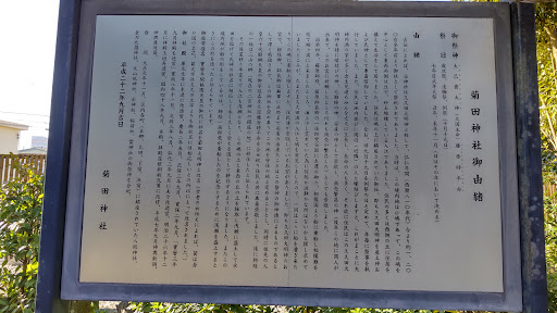 古伝によれば、当神社は久久田大明神と称して、平安時代の弘仁年間(西暦810年代)には神社として創建。 当時は、この境内地は小嶋で、この嶋を中心として東西両側は岡、砂土堆積している入江だった。住民の多くは西側岡の崖下に住居を構えて生活、住民は嶋の上に鎮座されていたお宮、即ち久久田大明神を産土神および氏神として奉斎信仰していた。 なお。旧9月19日を例祭の日と定めて、年毎に祭事を執行。 また、住民は氏子区内並びに周辺(近郷)の人と縁を結ぶと、これがまことに夫婦円満の家が多く子供達もみんな丈夫に成長、長命の人も多く、それ故に住民はこの久久田大明神を特に縁結びの神、厄難除の神、安産の神として崇敬し、商売繁盛の神(後年この地に商人が出来て、この宮に祈願したところ何れも商売が繁盛した)としても崇敬した。 治承4年、藤原師経、藤原師長卿の一部郎党当国に左遷のおり、相模国より船に乗船し相模灘を経て袖ヶ浦へ来た。海上が荒れていた為に波静かな所を探し求めていましたところ、たまたま久久田浦の入江と嶋を発見。一同はこの嶋に上陸、すると住民達が崇敬しているお宮があった 。久久田大明神のお宮で、師経、師長卿は無事に此処まで安着の出来たことはこの御祭神の御神徳によるものであるとして深く感銘されて、このお宮を崇め奉りてこの地を安住の地と定めることとし、同時に祖先の第60代醍醐天皇の御代延喜左大臣藤原時平命を合せ祀り、住民と共に奉斎崇敬。後に師経の一族は三山の郷(現在の二宮神社の鎮座の地)に移住したと伝えられている。 その後星移り年変わりて入江も浅瀬となり、この嶋の土と東西の岡の土を採取し浅瀬に盛土して水田を拡げて氏神の社名に相応しく永く久しく栄える国として耕作するようになった。またこの境内地が船の形をしているのは、師経一族郎党が着船したのを記念とするために浅瀬を盛土するときにこの形を造ったと伝えられている。 寳暦年間桃園天皇の御代に社名を菊田大明神と改名。 大正元年11月、区内各町(本郷、丸田、下宿、浜宿)に鎮座されていた八坂神社、金刀比羅神社、大山祗神社、水神社、稲荷社、雷神社の御祭神を合祀。