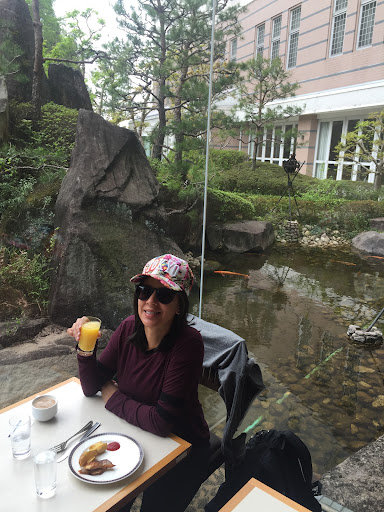The lobby has a money exchange machine, amenities (toothbrush, razor, tea bags, hairbrush, etc.) luggage weighing scale ( 荷物用はかり ) and wonderful staff that offer great bilingual service in Japanese / English. The room was booked by an airline due to unseen delays, so it was a short notice. I stayed in a twin room that came equipped with everything: a mini fridge, water kettle, towels, free wifi, a tv and mugs for tea. The room cleanliness though was very questionable. You can tell the room is rundown from the scuffs on the toilet and the rust in the overhead above the sink. It is an old hotel I suppose. The body towel I got in my room had a dark stain in it (coffee maybe? 😬) and there were stains on the bed comforter. The beds only had one pillow. The mattress is firm but not hard. I had a comfortable sleep, but the cleanliness was an issue for me personally (I am a germaphobe). Pajama top was provided and it was clean. The breakfast service was extremely great. It is buffet-style with a wide variety: tuna + yellowtail sashimi, ramen station, Chinese food, karaage chicken, coffee / tea machine, miso soup, and more. There was a small dessert station with pudding. There was also a mackerel / squid grilling table but I didn't get to try. There was a great window view of the garden outside with a koi pond. The breakfast service really made up for the whole hotel experience. I would definitely come back for the breakfast and free shuttle service, but because of the room cleanliness I may try other places. By the way, the room is much bigger than your standard Japanese hotel room, so for the price it is good value. I would recommend for families that do not pay mind to cleanliness much. They do not provide complimentary water, but there is water in the breakfast restaurant.