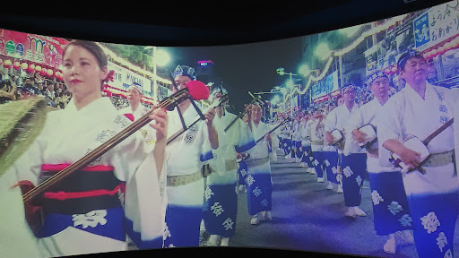 一つ目のオススメは、入ってすぐの360度シアター! 残念ながら2か所くらいプロジェクターの色が故障していたのですが、それでも360度の阿波踊りは、踊っている人の表情も楽しそうで、釣られてテンション上がってしまうこと、間違いないです。自分もグルグル回りながら鑑賞すると楽しめます。 短い旅では行けない徳島の風景も色々写されるので、ぜひ、一回り終わるまで、なんなら2回目の阿波踊りが終わるまで、ひたすら鑑賞してみてください。先を急がなくて大丈夫です、その先、そんなに面白いものないので(爆)なお、お婆さんの小唄は長すぎますけど耐えて(汗)