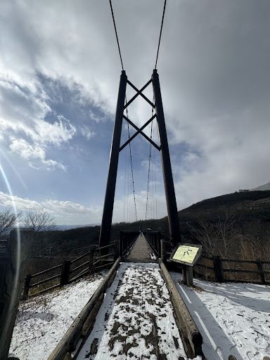 The bridge shows various appearances depending on the weather. On a clear day, visitors can enjoy the natural scenery, but unfortunately, the weather was bad this time and the area was shrouded in fog. Even so, the suspension bridge that emerged thickly from the fog was very fantastic and worth seeing. Listening carefully in the middle of the bridge, you can hear the faint sound of the mountain stream flowing under the bridge, which was also pleasant. The parking lot is relatively large, and it is not too far to the suspension bridge. The trail on the way to the bridge is well maintained, so casual attire is not a problem. There was a warning sign that a wild bear had recently appeared, so it would be reassuring to have...
