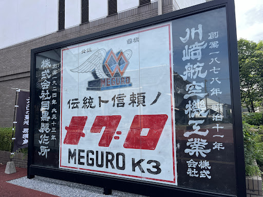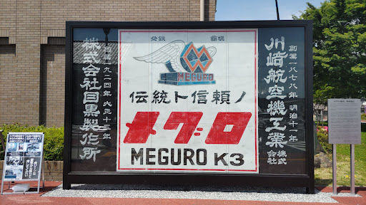 メグロの聖地 那須烏山 1924年(大正13年)、村田延治と鈴木高治によって、現東京都品川区目黒の不動前駅付近にて創業した目黒製作所(メグロ)。 創業から4年後の1928年(昭和3年)には、三輪車用の変速機を初めて国産化し、それが軌道に乗ると1937年(昭和12年) に初の単気筒500ccのオートバイ 「メグロ号Z97型] 発売。好業績を残した。 その後、太平洋戦争末期の1944年(昭和19年)には空襲を逃れるため、東京の大崎から那須烏山に工場を疎開することになった。 目黒製作所は、第二次世界大戦の激化とともにオートバイ事業を中断。航空機の部品を製作した。 戦後、国内で自動車関連の生産が再開されると、鳥山工場では主に「メグロ」ブランドの変速機を製造した。 復興に伴うオートバイ市場の拡大を受け、烏山工場では戦前に造っていた500ccモデルの再生産を開始。 1950年(昭和25年)に250ccのジュニア号が発売されると大ヒットし、1958年(昭和33年)頃まで業績の拡大が続いた。 東京大空襲で目黒の本社工場が全焼するも、終戦の翌年に生産を再開し、会社を再び軌道に乗せることができたのは、那須烏山の工場があったからといえる。 那須烏山は「メグロ」の城下町として活況を呈し、当時実に市の1/3の人が目黒製作所に関わっていたとされる。 昭和30年代前半に入ると、国内の競合メーカーが新機軸の小型オートバイを相次いで発売、国内市場に変化が訪れた。 この時流に対応するため戦前から続く「大排気量の名門」目黒製作所は、1960年(昭和35年)に当時カワサキブランドのオートバイを製造していた川崎航空機工業と業務提携。 この提携により、250ccクラス以上は目黒製作所が、50~125ccクラスは川崎航空機工業が生産を担うこととなった。 目黒製作所はその後、川崎航空機工業と1964年(昭和39年)をもって一体化。 創業から40年以上続いた目黒製作所の歴史は幕を下ろすこととなった。 目黒製作所はその歴史を閉じたが、「メグロ」はその生産台数の多さと、過剰品質とまで言われた耐久性から、一定数が全国各地に残った。 そして、昭和50年代半ばからクラシックバイクを趣味とする愛好家が現れ始めると、「メグロ」の人気は再燃。全国で修理保存されるブランドとなった。 那須烏山では今でも当時の目黒製作所を知る市民が多数存在し、その優れた技術を引き継ぐ工作所なども現存している。 2020年(令和2年)11月、カワサキが「メグロ」ブランドをリバイバルし、MEGURO K3を発表した。 「メグロ」の歴史と高い技術を継承するカワサキは、国内最古級のオートバイメーカーというアイデンティティを持っている。 「メグロ」発祥から90余年の間、カワサキのなかで脈々と受け継がれてきたオートバイへの情熱が、MEGURO K3の発売へとつながったのである。 本看板は、カワサキがMEGURO K3を発売したときに製作し、実際にプロモーションで利用された実物です。 製作したのは、日本のサインペインター界のパイオニアとして数々の有名ブランドの店舗サインやグラフィックを手がけてきたNuts Art Works(ナッツアートワークス)。 全て手で描かれています。この度、「メグロの聖地 那須烏山」プロジェクトに賛同いただき、カワサキモータース株式会社様より寄贈いただきました。心より感謝申し上げます。