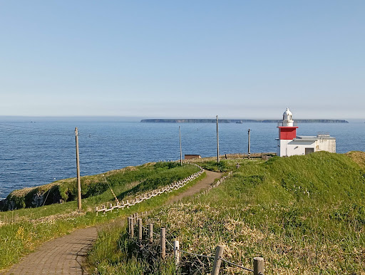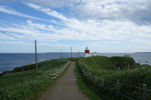 車石を見るためには、花咲岬の駐車場から遊歩道を歩いていきます。周囲は公園として整備されているので、自然を眺めながらのんびりと進んでいきましょう。視線の先に見えるのは、花咲灯台。「日本の灯台50選」にも選定されており、塔高は10mほどです。