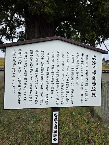 鬼婆が退治され土葬された場所といわれています。鬼婆伝説は悲劇そのものです。京都で暮らす優しくて気品ある女性「岩手」は、世話係として仕えていた姫の苦しそうな難病を治せないかと悩んでいました。そこに諸悪の根源である占い師が現れ、薬として胎児の生き肝があれば治るとそそのかし、岩手はそれを求めて東北へ旅に出ます。老婆になるほどの不毛な長旅の末、福島の安達ケ原にたどり着いた岩手は、旅人を襲って生き肝を奪う鬼婆と化してしまいます。ある夜、故郷から逃げてきた身重の娘が宿を求めたので、胎児を引き出すために殺してしまいます。娘が「私の死を母に伝えてください」と残した時、鬼婆はその娘が自分の実の娘であることに気づきますが、時すでに遅く…。仕える姫のために実の娘を殺してしまったことに耐えられなくなり、狂乱した鬼婆はますますエスカレートします。ある日、鬼婆の噂を聞きつけ立ち寄った旅の僧侶を襲いますが、僧侶は持っていた観音像を掲げ、鬼婆は観音の力に打ちのめされ、ついに成仏しました。僧侶は悲劇的な運命を憂い、鬼婆をこの黒塚へ弔った、と伝えられています。