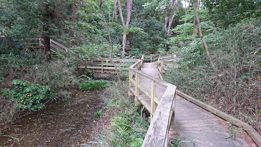 緑地に入ると木製でできた遊歩道があります。 湧水から流れる沢沿いに整備されていて、奥に入ると雑木林で緑に囲まれています。