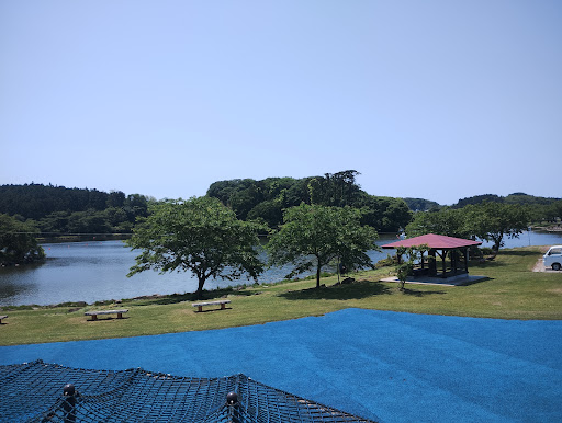 白瀬南極探検隊記念館の前にある公園ということで、南開丸を模した遊具があったり南極を推していました。 また、この付近は象潟と同じく、鳥海山の山体崩落の影響で生成された凸凹構造の地形が広がっていて地理的にも面白いと思います。公園のそばにある竹嶋潟にある島もそれだと思います。