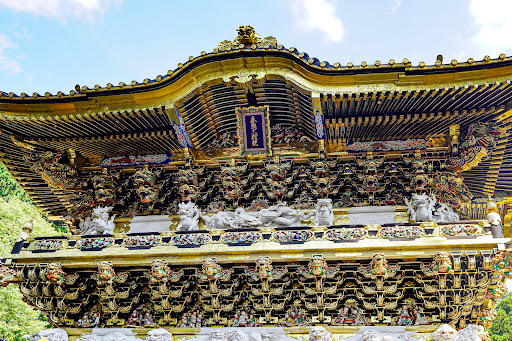 Read more日光東照宮の代表的な楼門で国宝に指定されている日本で最も美しい門の一つで、高さ十一・一メートルの二層造りで正面の長さは七メートル奥行きが四・四メートルあり、入母屋造り・三門一戸・八脚楼門・四面・軒唐破風付きの豪壮な楼門です。 正面の唐破風下には、後陽成天皇より贈られた勅諡号である「東照大権現」の扁額が掲げられていますが、これは後水尾天皇が御直筆された文字の扁額です。 「陽明門」という名前は京都御所にある十二ヶ所の門の内、東にある門から名前を取って「陽明門」と名付けたと伝えられます。 つまり日光東照宮を造営する時に京都御所の東の方角を守る鎮守としてこの日光東照宮を造営し、京都御所を守護するという意味を込めて「陽明門」の名前を頂戴したと考えられます。 陽明門には故事逸話や子供の遊び聖人や賢人など五百八体の彫刻が一枚板に透かし彫りで施されていて、一日中見ていても見飽きることがない美しさから別称で「日暮門」、その他に御水尾天皇から賜った扁額の「東照大権現」から「勅額門」、また日光は江戸から見ると真北に位置し日光東照宮の真上に北極星が輝く、宇宙の最高神と考えられた北極星を拝礼することから「北辰門」とも呼ばれています。 陽明門の十二本の柱は「グリ紋」と呼ばれる渦巻き模様が彫られていますが、内側の右から二本目だけが他の柱と逆に「グリ紋」が下向きになっています、「魔除けの逆柱」と呼ばれていて完成されたものは崩壊へ向かうという前提からあえて柱一本だけを他の柱と向きを変えて逆さまにして取り付け未完成として「崩壊を防ぐ魔除」としています。 平成二十五年(2013年)からの平成の大修理を終えて装飾廻りの根本的な改修が行われ絢爛豪華な輝きが蘇っています、陽明門は江戸時代の建築様式・工芸・彫刻・絵画などの江戸文化がすべて凝縮されて詰まっています。 現在の日光東照宮の陽明門は徳川家康公の二十一回忌にあたる寛永十三年(1636年)に徳川幕府三代将軍徳川家光公によって...