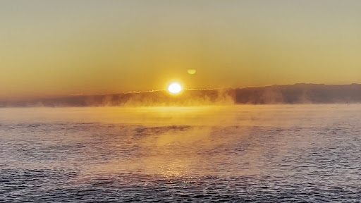 In the early mornings of winter, when the wind is calm and the temperature is low, the cold air stays above the warm sea surface, and the vapor that evaporates from the sea surface condenses rapidly, creating fog.