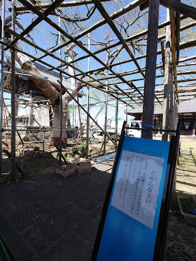 ★山門の先に立派な樹齢約300年の枝垂れ桜、でも幹周りをノコギリで伐られたと看板が掛かっ...