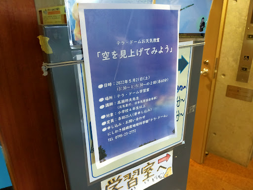 Read more日本のへそ公園内にあるにしわき経緯度地球科学館テラ・ドームですね。 小さな科学館ですが、プラネタリウムや天体観測、体験学習等があり充実しています。 プラネタリウムは横長のベンチが6席位あり上映時間は約25分くらいです。映像はあまり綺麗では無くて古い映画を見てる感じです。お話の内容は地球から120億光年離れた壮大なお話で子供には難しいかもしれません。 ☆1光年とは光が1年に進む時間です。距離にすると9兆4605億キロ。新幹線が1光年走ろうとするとなんと361万年かかります。とんでもない数値ですね。 では120億光年先に行きたければというのはもう想像がつかないですね。