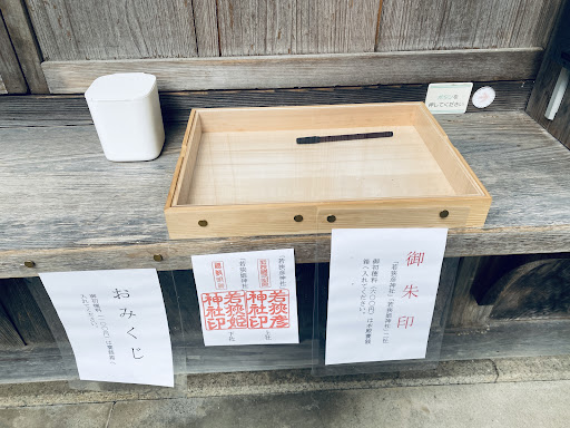 Read moreI am a collector of Ichinomiya Shinto shrine stamps in Japan. I visited Wakasahiko (the supper shrine) which is the Ichinomiya and then went to Wakasahime (the lower, but much grander) shrine about 1km down the road. I visited during obon holidays, and was quite sad to find there were no shrine stamps left in the box. I rang the bell, called the posted phone number (which I heard ringing inside the building, but no answer) and waited almost 45 minutes to see if they were out shopping. But maybe the priest was on a long vacation and the shrine papers had run out.