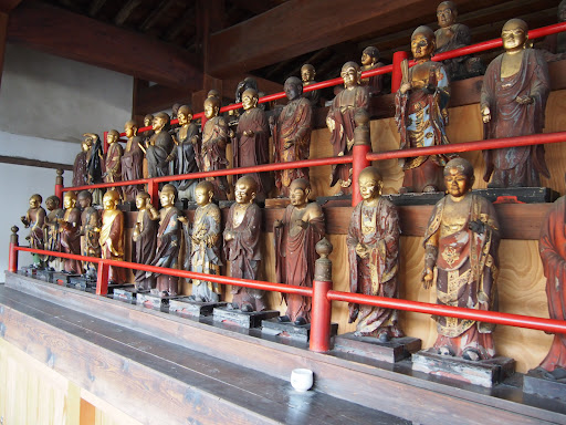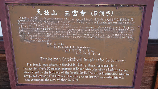Read more伊豆箱根鉄道大雄山線五百羅漢駅改札を出て通りを右手方向へ進み、次の角を右折すると正面に見える寺院が駅名の由来でもある五百羅漢で有名な曹洞宗寺院の玉宝寺である。五百羅漢駅からは徒歩3〜4分程度の距離である。山門手前左手には六地蔵尊が立ち並び、山門を潜った左手には延命地蔵尊と鐘楼、正面本堂の左右には不動明王の石仏等が彼方此方に点在している。右手の庫裏前の達磨大師像を見つつ庫裏にて対応して頂いた若い女性に断りを入れて本堂を参拝させて頂いた。中央御本尊の左右に並ぶ像高30〜60センチメートル程の像が立ち並ぶ様は圧巻である。拝観料は無料なので仏像が好きな方にはお薦めする場所であるがあくまで観光地ではないので気を...