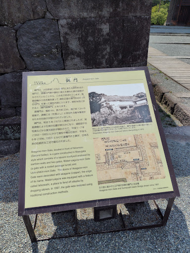 【銅門】 銅門は、小田原城二の丸の表門にあたる桝形形式の城門で、渡櫓の門扉や鏡柱に耐火を兼ねた銅の装飾がなされていることから、この名で呼ばれています。馬屋曲輪から住吉橋を渡って、枡形正面の埋門 (うずみもん) 形式の「内仕切門」を潜って枡形内部に入ります。枡形を西に折れると「銅門渡櫓門」となります。 渡櫓門は、幅約 6m、長さ約 23m、高さ約 12m の規模で、渡櫓に「石落とし」と呼ばれる敵を撃退するための仕掛けが設けられていました。 銅門は、明治 5 年 (1872) に解体されましたが、発掘調査により石垣の位置が明らかになり、城絵図や古写真などから復元設計が検討されて、平成 5 ~ 7 年 (1993 ~ 1995) にかけて桝形や櫓台石垣が、平成 8、9 年 (1996、1997) にかけて渡櫓門や土塀が、日本古来の伝統的な工法で復元されました。