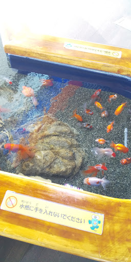 面白いと思ったのは真上から見る水槽。 子供でも上から見える高さなので触れる高さにあります。 そこに色んな種類の金魚やメダカが居ました。 金魚をこんな感じに見せる所は見たことがありません。 ちゃんとそれぞれの説明もあって勉強になると思います。 それと同じ感じで小型のサメも別水槽で展示されていましたが、手を入れないでって警告が書いてありましたが、子供なら入れかねません。 子供目線なのはいいのですが、あれは大丈夫なのか気になりました。