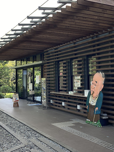 大通りから邸宅までの広い道、奥に進むと吉田茂さんのイラストが目に入ります。管理事務所でトイレ休憩コーヒーの自販機があります。