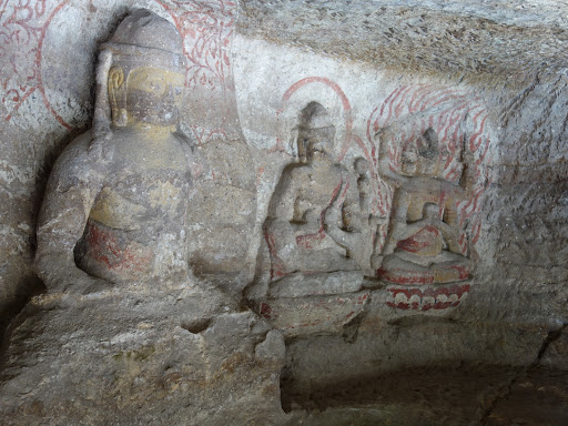 Read more大分市内に残る平安末期の磨崖仏。 奥行き1.5mの石窟の中に5体の磨崖仏彫り出され、鮮やかな朱色と相まって保存状態の良さをうかがわせる。 中でも向かって一番左、身体に蛇を巻き付けどくろの首飾りをした『深沙大将立像』の異様ともいえる造形が目を引く。こちらは三蔵法師が天竺に赴いた際に現れた守護神で、お腹に描かれた少女の顔は内面の優しい気持ちを表しているらしい。 またすぐ右の壁面には、一本の蓮の茎から3つに枝分かれした蓮花の上に阿弥陀三尊像が彫り出された『一根三茎仏』が残る。こちらは石窟の中ではないので風化が激しく、何らかの手当てを望みたい。 規模は大きくないものの、他にあまりみない造形や保存状態の良さ、何よりこんなところにこんな素晴らしい摩崖仏が、という違和感・驚きで...
