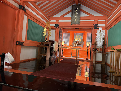 海神である綿津見命を祖とする地祇系氏族である阿曇氏が代々祭祀を司ります。 御祭神は、少童命三座(表津少童命、中津少童命、底津少童命)、息長垂姫命(神功皇后)、住吉三神(表筒男命、中筒男命、底筒男命)、高良玉垂命です。