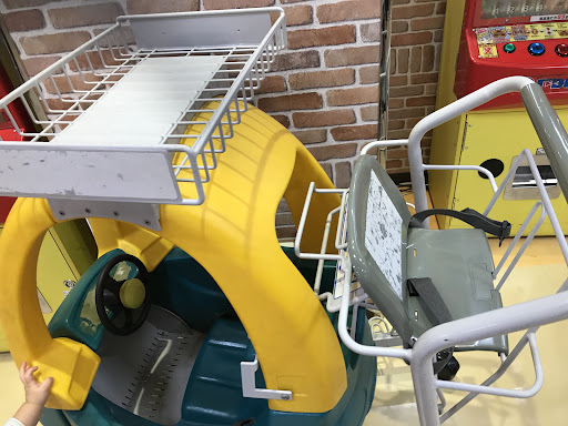 子ども2人乗せ買い物カートが屋上から入ったところに数台あります。 上に乗る子の方になにか持たせたりして大人しく乗れるのであれば荷物も載せれるし2人便利です。ちなみにコムタウンにも同じのがありました。キャラ物のカートもあります。 2階にはキャラ物や新幹線の服などもある子ども服も大人の服も売っているあかのれんというある程度の規模のお店があり、キャラ靴下、子ども服はあまり広いスペースではないですが90cm位から新幹線や恐竜や女の子らしい服などこだわる子が好きそうな服も多いです。1階の靴屋さんも男の子女の子うけしそうなキャラや新幹線など小規模の割に充実してます。 あかのれんからすぐ近くにゲームセンターや有料の遊び場があります。新幹線、アンパンマン系が多いです。
