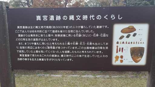 Read more真宮遺跡は、縄文時代から中世までの複合遺跡です。昭和48年に区画整理事業に伴う工事中に発掘され、約4万平方メートルから縄文時代の平地住居跡12軒、土器棺墓37基、土坑6基、弥生時代の方形周溝墓1基、古墳時代の竪穴住居跡11軒、奈良・平安時代の竪穴住居跡19軒と堀立柱建物跡1棟と埋甕1基が発見されている。縄文時代の住居跡からは、土器、石斧や石鏃、石皿といった生活用具、石刀・石剣や土偶・岩偶・動物形石製品...