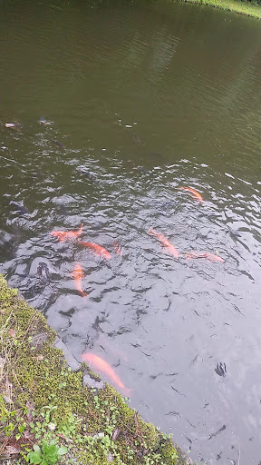 太鼓橋の周辺から鯉への餌やりもできるが、雨の日は滑りやすいポイン...
