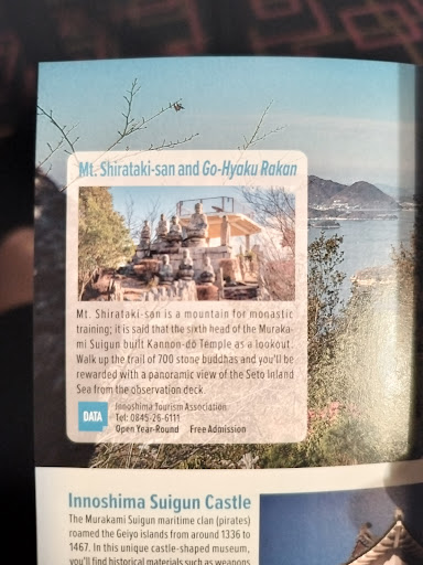 Read moreMt. Shirataki-san is a mountain for monastic training; it is said that the sixth head of the Muraka mi Suigun built Kannon-do Temple as a lookout. Walk up the trail of 700 stone buddhas and you'll be rewarded with a panoramic view of the Seto Inland Sea from the...