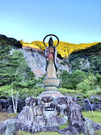 Lovely peaceful park. Statue is Kannon, Konzeon Bosatsu. Nice halo. Beautiful coloring. Avalokitesvara of Lotus Sutra, Renge Kyo, who takes form of Quan Shi Yin, who is Konzeon Bosatsu. Avalokitesvara is a central figure in Buddhism who is the compassion of all Buddhas and the Bodhisattva of compassion. A Bosatsu has abandoned the self-interest of their own rest in Nirvana / Nibbana to continue in service to all sentient beings. Buddhist teachings from Nichiren in the 1200's have emphasized Lotus Sutra and have led to proliferation of statuary showing the wide variety of forms of the Bodhisattva...