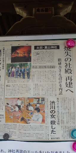Read moreこちらの高山神社は平成二十六年十二月三十日に放火により御社殿が焼失。現在は寄贈されたお宮が広い土台にぽつんと建てられております。当時の火事の影響の物かはわかりませんが近くの建屋の屋根が焦げているように見えました。 以前は1つ目の階段を登った所が社務所だったようですが位置が変わり、横を抜け裏側に移動したようです。 社務所では御朱印を直書きでいただけます。種類が多く1000円、500円、300円の御朱印から選べます。種類はかなり多いです。 書いていただいてる間、奥のお座敷のような場所で待たせていただいたのですがこちらに焼失前の御社殿の写真等がありました。 早く再建されるの...