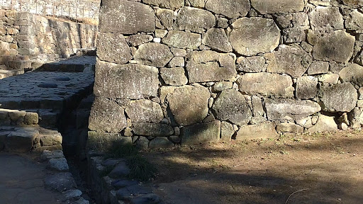 では目玉の石垣を見ていきましょうか。特に大手門跡から真ん中の石敷きの道を挟んで、左右に広がる石垣の規模の雄大さには息を飲みます。 ぐえ? 石垣のコーナーがキッチリ算木積み(特別に細長い石を交互に積上げて、崩壊し易いコーナー部分を強化する先進的技法)になってる・・ホンマかいな? これって確か関ケ原以降に定型化する技法じゃなかったっけ?。金山城は秀吉の小田原征伐で陥落後は、廃城になっているハズですが。