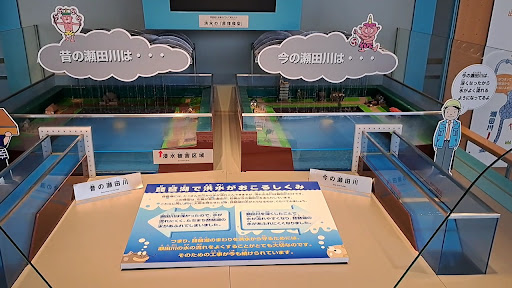 シアタールームでクイズ形式の動画を視聴したり、大雨が降った時に排水を操作して土地が水浸しになるのを防ぐゲームや、雨が降ったらどれくらいの水が流れるかわかる模型など色々体験型の設備が揃っています。