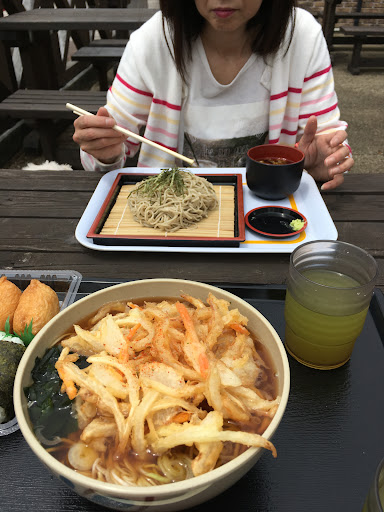 小さな食堂が入ってるが、ラーメン、蕎麦、定食がメニューに並ぶ。 そこそこの値段取るが量が多い(天ぷら定食だったかな?女性には多いかも)。 天ぷら蕎麦=一般的にはかき揚げ蕎麦と言う〜は、大盛頼むとどでかいかき揚げ2個。 ど〜ん!とon。 男性でもちょい持て余す。 外で食べれるので、ワンコと一緒に麺啜れる。
