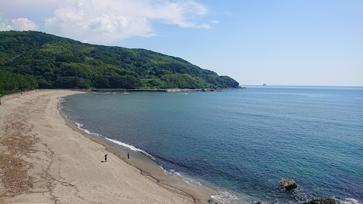 Read more案内板には「海水浴場ではありませんので、海水浴での事故について市では責任を負いかねます…」と記してますが、防波堤の上、松林の中の海浜公園にはシャワールーム(笑)とトイレ、ついでにAEDも設置してあって、堤防の沖、波が立つところではサーファー達も波を楽しんでます。 砂浜は500メートルほどでしょうか、私はいつものごとく岩場で光合成してたので(爆)波打ち際を歩いただけでしたが、急に深くなるみたいで、外海に面してまもいますので、小さなお子さん連れは十分な注意が必要です。 海に向かって右手の消波ブロックの先は岩場になっています。足場は良くないですが、結構先に進めます。ただし、潮が満ちてくると波の荒い海の中を歩かなければならなくなるかもしれませんので、これまた要注意です。 目立つゴミも打ち上げられてなく、綺麗な砂浜でした。監視員などいませんので、繰り返しますが、遊泳はお勧めしません。せいぜい、腰が浸かる深さまでの磯遊び程度で...