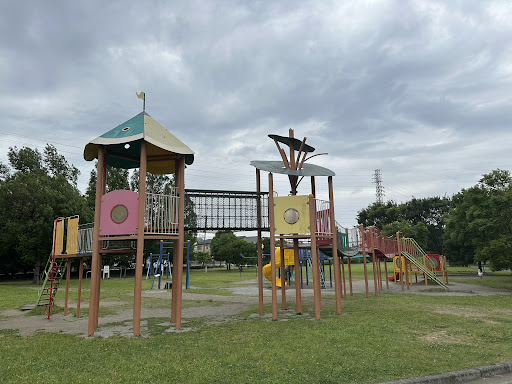 Small park in Nisshin in Kita-ku. It is used a lot by locals. You can use picnic sheets here and kids can ride bikes. They have a nice playground with various equipment and a sand pit. There are swings for toddlers that have support on the front and back. There are also swings for older children. They have various slides including a large one with two windy slides and one straight one. There are spring rides around the sand pit.