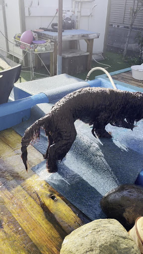 この施設は温泉に併設しています。 ということで、プールにも温泉がひいてありました。なので,プールに少し色がついているようです。 (白いわんこは毛に色がついてしまうかもということなのでご注意ください。) 温泉と言えど、水と合わせているのでプールの水温はしっかり冷たいです。 温泉プール上がり後、ふわふわな毛質になりました。