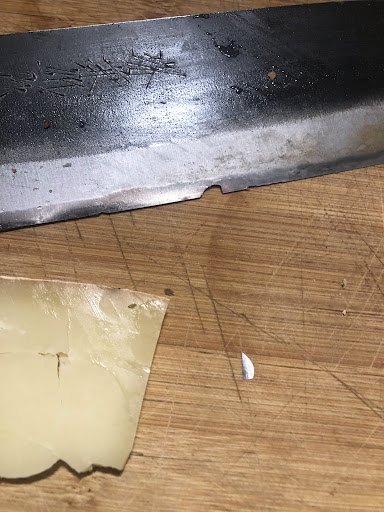 If 2 of them are perfectly fine, I have had a really bad experience with the third one. Of course I apply the same protection to it as the others, but on several times the blade has been deteriorated when cutting vegetables (see pictures), and a big chunk of it just fall when cutting a cheese (that was not rock solid, I rather be precise).
