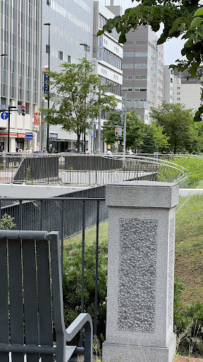 KAMOKAMO STEP 北1東1 「団塚栄喜」作。 創成川の上流、中島公園を鴨々川という川が流れている。 明治時代には、現在の南7条付近の川沿いに、リンゴやナシの果樹園があった。 これはちょうど鴨々川の方向を示していて、自然にふれあいながら、川の歴史にも触れるきっかけとなっている。