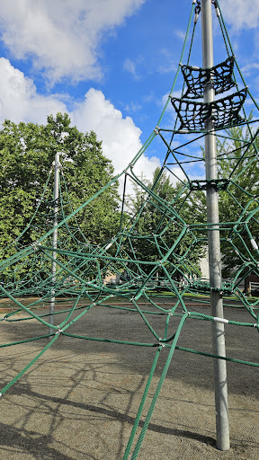 Long park with bike and walking trails to the side. From the main road, there is a dirt area for soccer and baseball: as you go further in, there is a rope apparatus for climbing, then two large playgrounds for older kids. There is also a taller-than-normal zipline here so kids can start about 3 or 4...