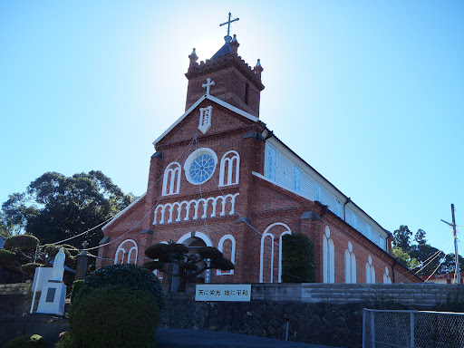 佐世保市黒島にあるカトリック教会。 世界遺産長崎と天草地方の潜伏キリシタン関連遺産の構成遺産である黒島の集落の代表的な教会です。 禁教令が出されていた江戸時代に黒島を治めていた平戸藩が島の牧場を廃止し田園を開墾するために入植者を募ると大村藩の隠れキリシタン達が挙って黒島へ移住しました。当時は弾圧を少しでも逃れるため離島に移住する隠れキリシタンが多くいました。神社の氏子やお寺の檀家として代々信仰を密かに受け継ぐ中で、幕末に大浦天主堂で信徒発見がなされると、その2ヶ月後には黒島から信徒であることを打ち明ける島民が次々と現れました。明治になりキリスト教が解禁されると島民約600名が洗礼を受け現在でも島民の約8割がカトリック教徒の方々です。 私の今回の九州旅行最大の目的地がこの黒島でした。黒島天主堂は明治時代に黒島に着任したマルマン神父の元で始まりました。レンガ造りのロマネスク様式の教会は外観からして美しい。このレンガは最初島で焼いていましたが後から大量のレンガを島外から持ち込み島の人々が手作業で建設予定地まで運んできたものです。私は電動自転車をレンタルして来ましたがそれでも脚がパンパンになるほど港から教会までの坂道はキツイです。当時レンガを運んだ人々の苦労が偲ばれますが同時にそこまでするほど自由に信仰が出来ることが嬉しかったんだと思います。内装もとても素晴らしく内陣には有田焼のタイルが敷き詰められ天井の木目は自然の物ではなく少しでも豪華に見せるため手作業で彫られたものです。特に有名なのが薔薇のステンドグラス。黒島のお土産品にも描かれています。太陽の光でステンドグラスの色が聖堂内に映し出される光景はとても幻想的でした。現在もこの天主堂では島の信者の方々がミサや御葬式を行っているので地元の方に御迷惑を掛けないようご注意下さい。 黒島天主堂は様々な映画やマンガ、アニメ等にも描かれています。昨年だと山田尚子監督のアニメ映画「きみの色」に登場しています。主人公トツ子が度々御祈りをしていた学校の聖堂の内装は天主堂がモデルになっていてこちらもステンドグラスが印象的な描かれ方をしています。作品の聖地巡礼で訪れるファンも多く今回私もその一人となりました。 黒島のウェルカムハウスでは黒嶋神社と興禅寺に加えてなんとこちらの黒島天主堂の書き置き御朱印を頂くことが出来ます。季節限定御朱印等もあるようです。教会なのに御朱印はありなのかと思ってしまいますがそこはGodalmightyということで(笑)黒島オリジナルの御朱印帳も販売していますので御朱印好きの方は...
