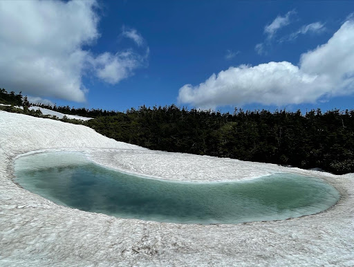 その沼、私は初めての訪問で何がすごいのか不明です。ドラゴンアイの様に、雪が浮かんでいた事が初めて?なのでしょうか、もう声をかけるのも憚られる程でしたので先に下山しました。 とにかく何十年で初めて初めてとおっしゃっていました。すごい事なのでしょう。